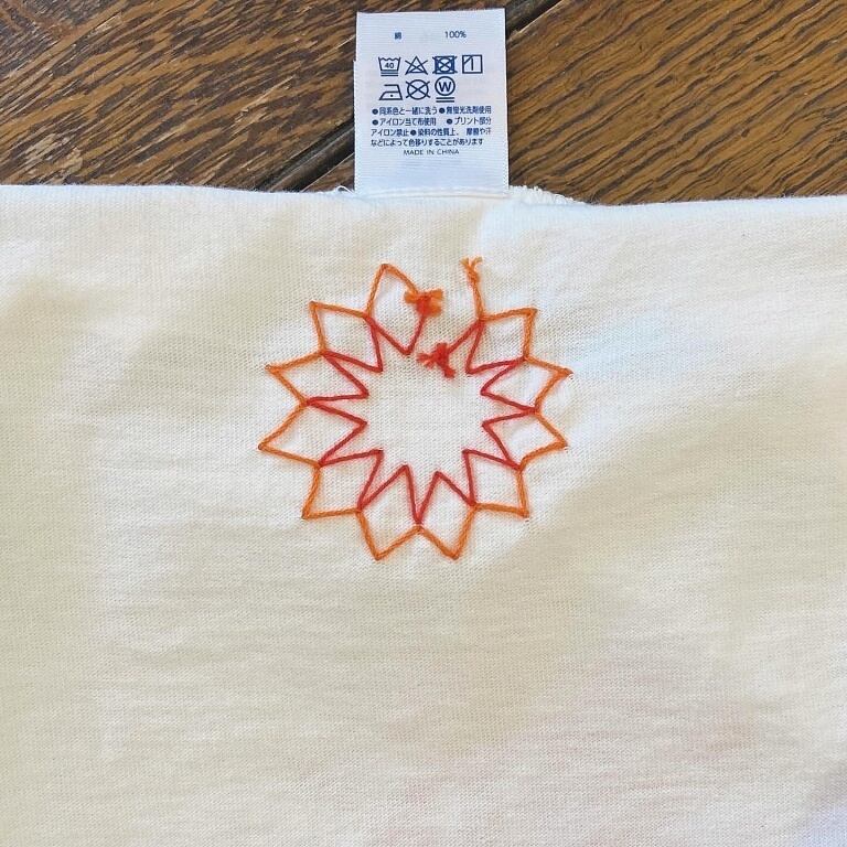 太陽の型抜きスタンプ+糸で描く太陽の背守りTeeです。