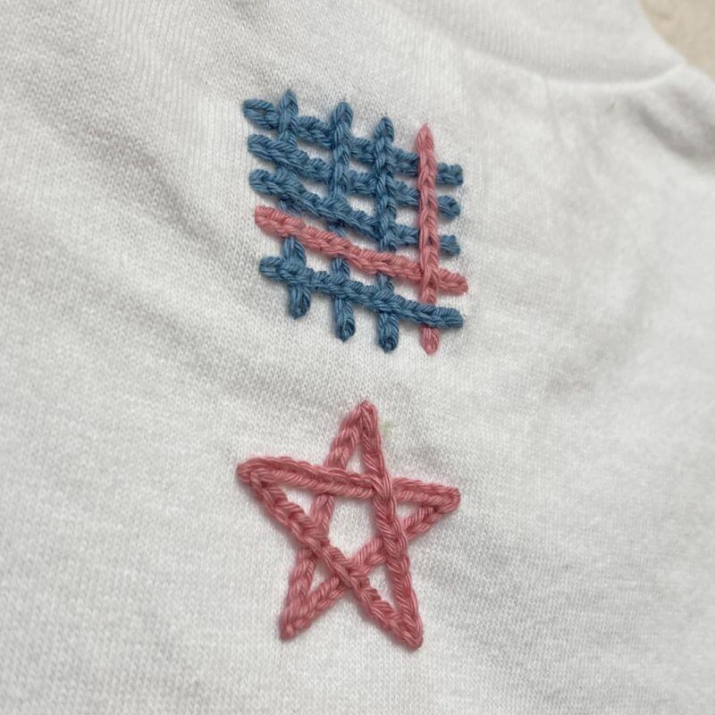 伸縮性のあるステッチ方法でTシャツの編み目の隙間に糸を組み入れてます。