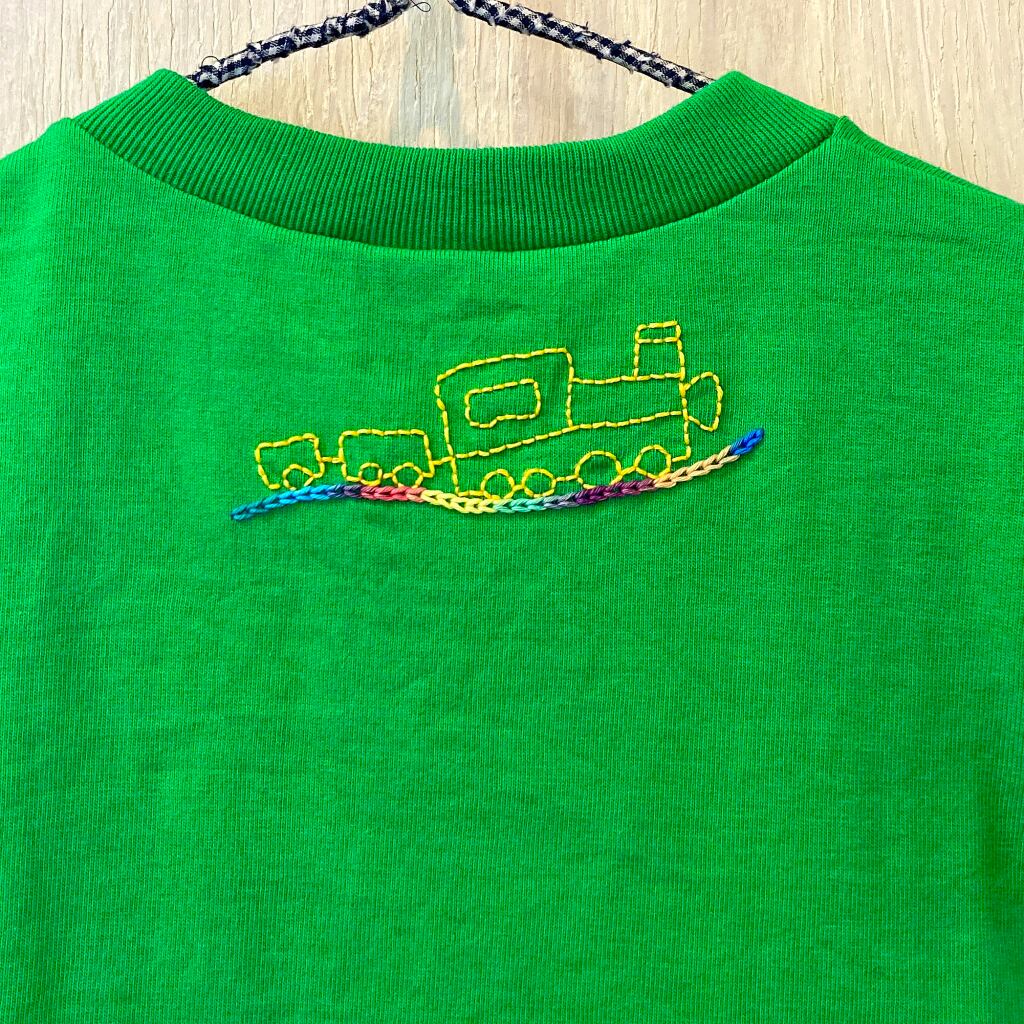 伸縮性のあるステッチ方法でTシャツの編み目の隙間に糸を組み入れてます。